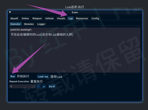 Game-其他游戏菜单教程Fivem丨GTA5 私服EulenEulen Lua 加载Eulen Lua 加载 注入成功后,点击Lua选项→Executor,然后点击你需要加载的Lua,再点击Run 当你点击后,会弹出选择文件的页面,这时你选择你下载的好的Lua加载就行 加载成功后,一般在右下角会弹出提示,告诉你按什么按键呼出Lua菜单
