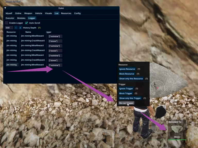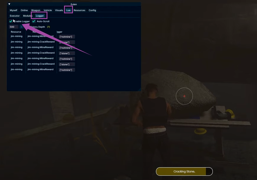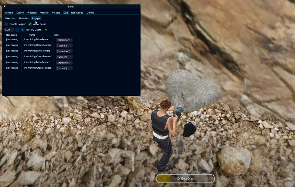 Game-其他游戏菜单教程Fivem丨GTA5 私服EulenEulen 刷钱教程本页总览Eulen 刷钱教程 前言 学习方法,举一反三丨如教程失效,那么暂时没有最新方法 大概说下原理,因为每个服务器都不一样,所以需要你自行举一反三! 说明 你需要在你的服务器上找一份赚钱的工作,例如:矿工 然后点击Lua选项,如图操作 找到你当前的工作/动作 类似帮你省去工作的时间,提高工作效率 然后继续工作,点击Logger并开启 类似RDR2职业最初的刷取收藏家等级的方法 使用半自动提高效率,目前没全自动的方法,正如上方所说,每个服务器不一样. 而且服主可能会在后台看得到你的操作,需谨慎,风险自行承担