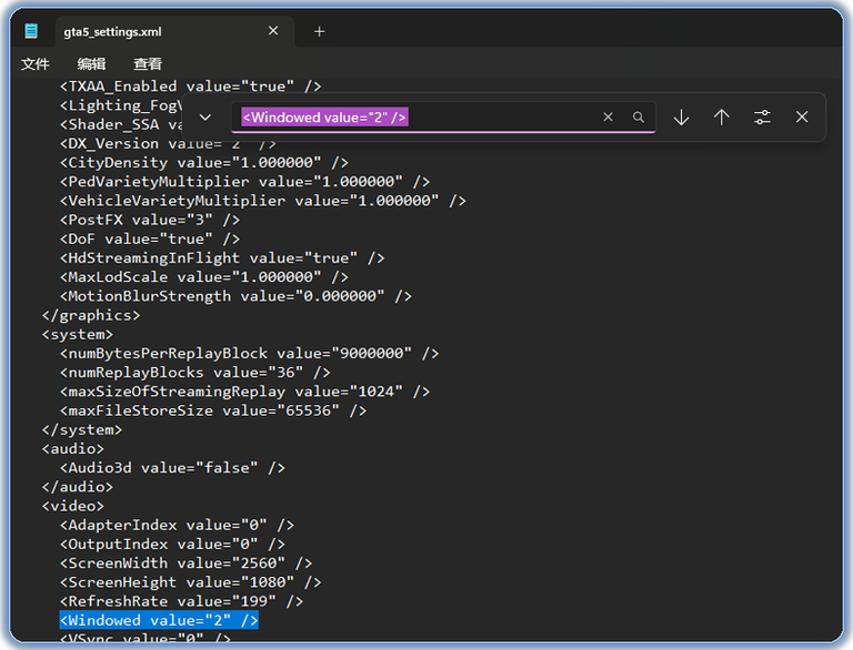 打开后使用上方编辑→查找功能搜索:<Windowed value="0" /> 把0改成2即可,如果你是默认的2,则无视此步骤