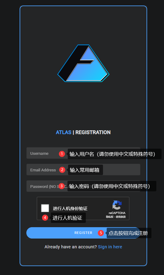 - 注册任何菜单最好只使用 数字 + 字母组合 , 长度在 8 位以上,尤其不要输入 中文 空格 与 中文符号 , 且极少数菜单不支持 英文符号