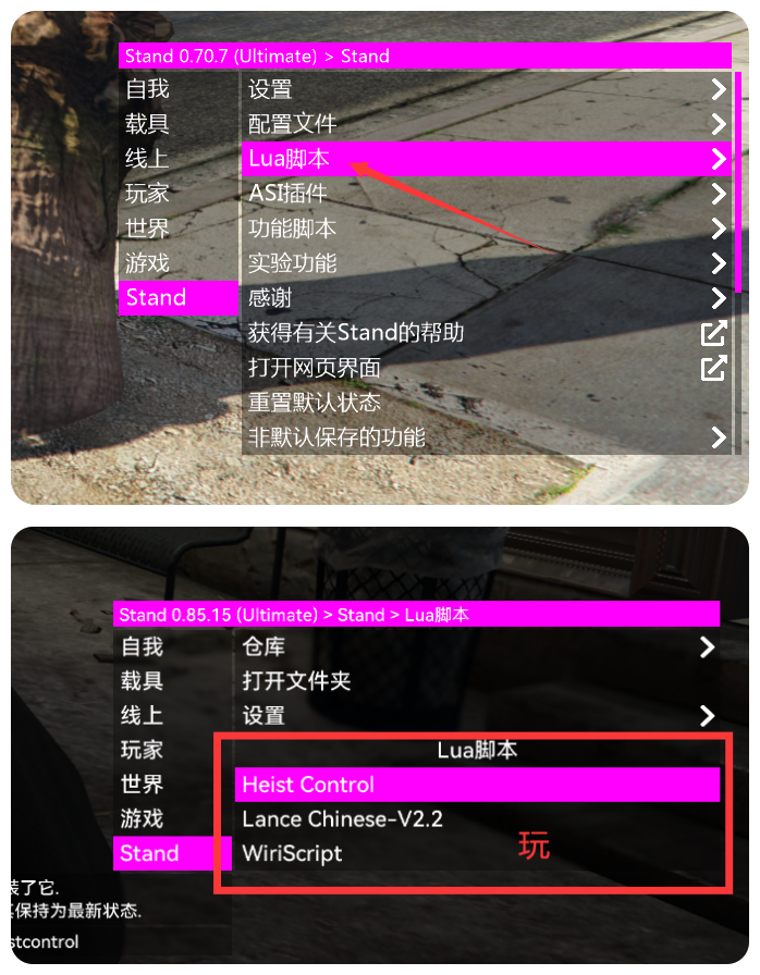 Stand > Lua脚本 > 仓库 选择你想要加载的Lua 推荐使用此方法,后续Lua更新后也可以直接从仓库内更新