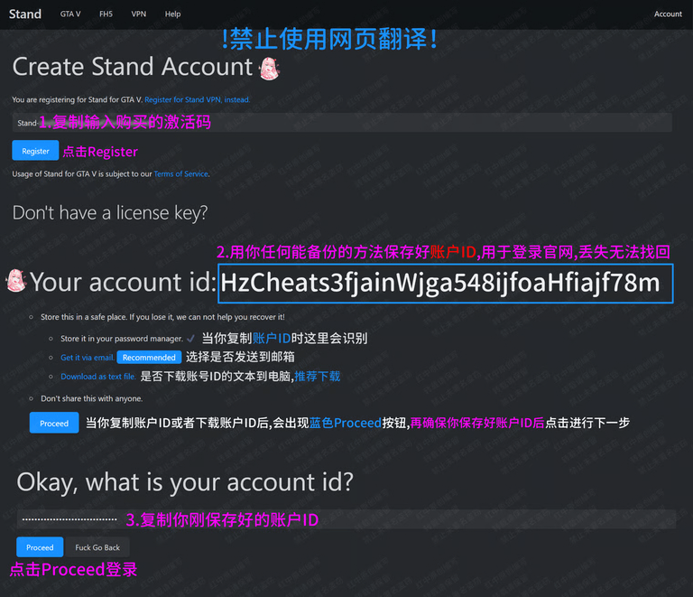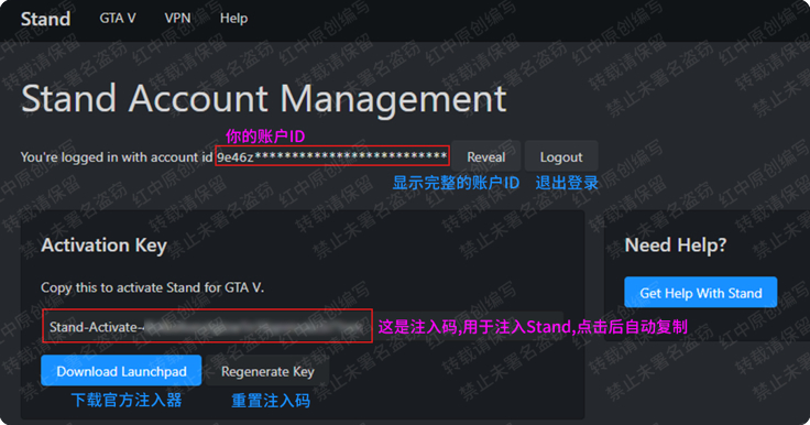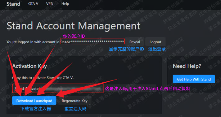 - 账户ID:用于登陆Stand官网,无法用于注入Stand,需保存好,丢失无法找回,丢失后目前没有任何方法能找回你的账户ID(用你所有能记住的方法来记住,比如手机备忘录/微信收藏/QQ收藏等等)