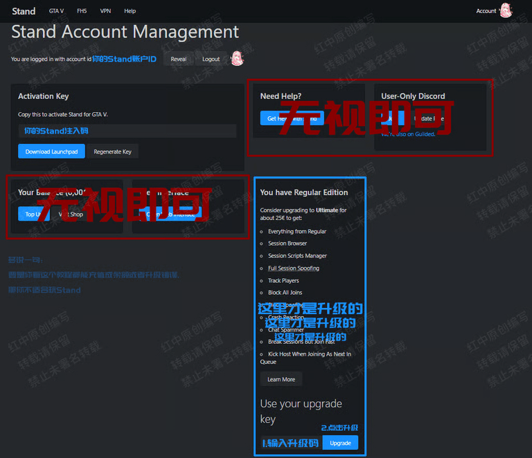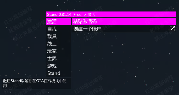 - 注入激活码:用于注入Stand,无法用于登陆官网(更换游戏账号注入建议去官网重新生成激活码注入,详情可查看Stand解绑教程)