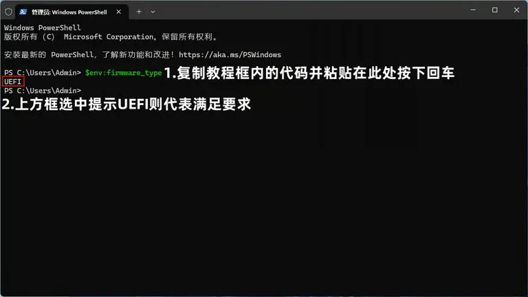 右键 点击屏幕左下角 Windows 开始菜单 - 点击 终端管理员(Windows PowerShell [管理员]),右键点击黑色窗口 - 再按下回车,确保为 UEFI (如不是,可重装系统或使用工具转,可参考 这里 (建议有个 U 盘 + 备份好重要数据)